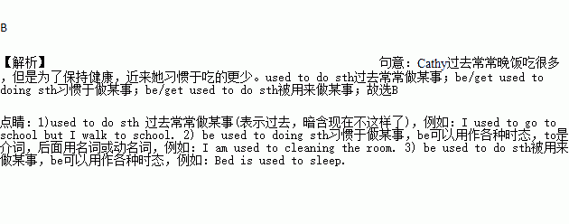 B ¡¾½âÎö¡¿¾äÒ⣺Cathy¹ýÈ¥³£³£Íí·¹³ÔºÜ¶à£¬µ«ÊÇΪÁ˱£³Ö½¡¿µ£¬½üÀ´Ëýϰ¹ßÓڳԵĸüÉÙ¡£used to do sth¹ýÈ¥³£³£×öijÊ£»be/get used to doing sthϰ¹ßÓÚ×öijÊ£»be/get used to do sth±»ÓÃÀ´×öijÊ£»¹ÊÑ¡B µã¾¦£º1)used to do sth ¹ýÈ¥³£³£×öijÊÂ(±íʾ¹ýÈ¥£¬°µº¬ÏÖÔÚ²»ÕâÑùÁË)£¬ÀýÈ磺I used to go to sch...The Long March 7 made its successful inaugural flight (Ê×·É). Zhang Yang told me the news ________ he saw it on the Internet.