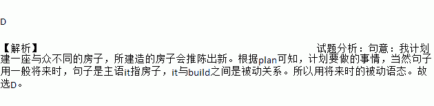 D 【解析】试题分析:句意:我计划建一座与众不同的房子,所建造的房子会推陈出新。根据plan可知,计划要做的事情,当然句子用一般将来时,句子是主语it指房子,it与build之间是被动关系。所以用将来时的被动语态。故选D。书面表达