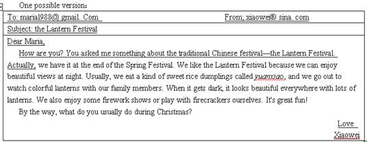 | Dear Maria, How are you? You asked me something about the traditional Chinese festival—the LanternFestival.Actually, ______________________________________________________________________. Love Xiaowei |