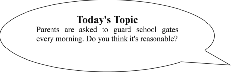 Safety comes first. Most primary schools suggest that parents should come along with their children on their way to school. I don't think it's a problem for the parents. They just have to stay at the school gate a little _______. Also, it's very crowded around school gates in the morning. Traffic accidents may happen. Only _______ school guards is not enough. If parents can help. there will be fewer accidents. | On weekdays, guarding schools and keeping students safe should be the school's responsibility — not the parents'._______. the time when they have to guard is usually about 7:40 to 8 a.m., the morning rush hour. Some parents might get caught in a traffic jam and late for their work, I don't think this task should fall on the parents. |