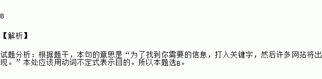 B 【解析】 试题分析:根据题干,本句的意思是“为了找到你需要的信息,打入关键字,然后许多网站将出现。”本处应该用动词不定式表示目的。所以本题选B。