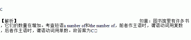 C 【解析】句意:图书馆里有许多书,它们的数量在增加。考查短语a number of和the number of,前者作主语时,谓语动词用复数,后者作主语时,谓语动词用单数。故答案为C。