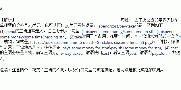 A ¡¾½âÎö¡¿¾äÒ⣺-È¥ÖÐÑ빫԰µÄƱ¶àÉÙÇ®£¿-µ¥³ÌƱµÄ¼Û¸ñÊÇ40ÃÀÔª£¬Äã¿ÉÒÔÔÙ¸¶20ÃÀÔªÂòÍù·µÆ±¡£ spend/cost/pay/take»¨·Ñ£ºÇø±ðÈçÏ£º(1)spendµÄÖ÷Óïͨ³£ÊÇÈË£¬ÍùÍùÓÃÓÚÒÔϾäÐÍ: (sb)spend some money/some time on sth. (sb)spend some money/some time(in)doing sth¡£ (2)take³£ÓÃÓÚ¡°...---The house is too old and dangerous. ----Yes. We should ________soon.