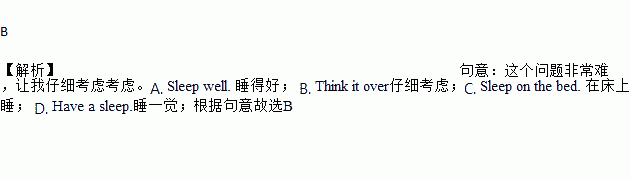 B 【解析】句意:这个问题非常难,让我仔细考虑考虑。A. Sleep well. 睡得好; B. Think it over仔细考虑;C. Sleep on the bed. 在床上睡; D. Have a sleep.睡一觉;根据句意故选BDon't__have__a__cow!I'll pay for the broken book.