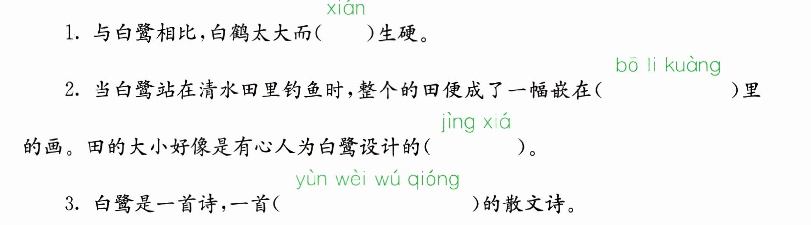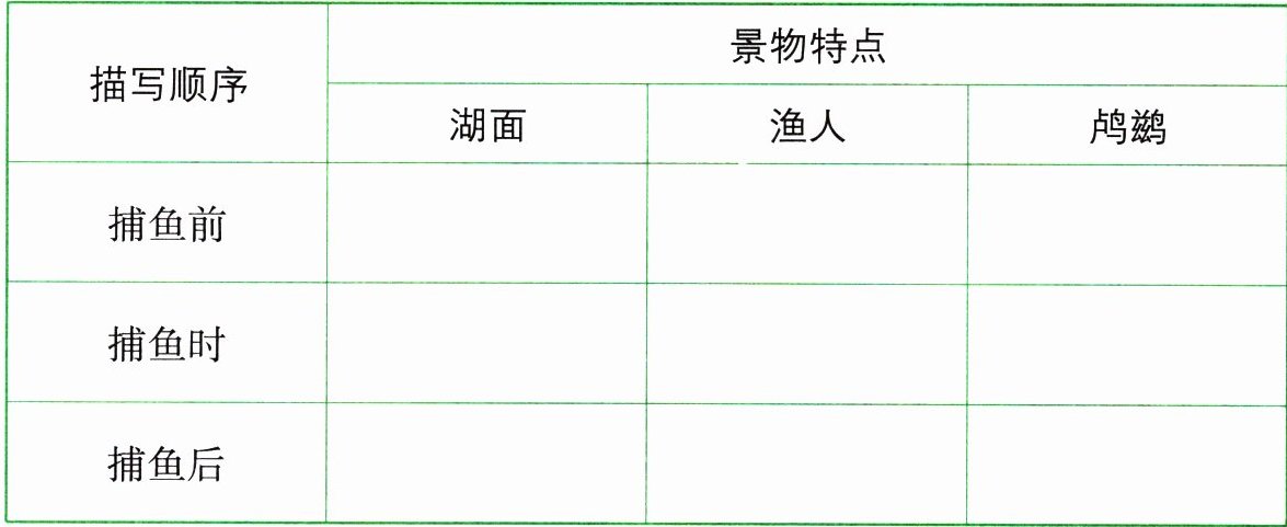 1. 短文描写鸬鹚捕鱼的经过,是按照捕鱼前、捕鱼时、捕鱼后的顺序来写的。