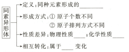 同素异形体是同种元素形成的不同单质。其物理性质差异较大,化学性质相似。相互转化过程中生成了新物质,属于化学变化。