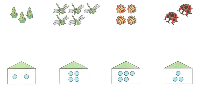 第二幅图中有5只蜻蜓,应与有5个圆点的房子相连;