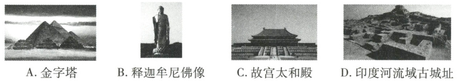 本题要求选择属于古埃及的古迹。金字塔是古埃及文明的代表,古埃及国王的陵墓,是其权力与地位的象征。释迦牟尼佛像是古印度佛教的象征,故宫太和殿是中国古代建筑,印度河流域古城址与古印度文明相关。所以只有金字塔属于古埃及。