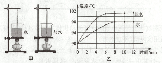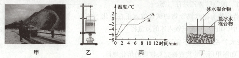 (选填“会”或“不会”) 沸腾. 完成上述实验后, 小涵又取了适量浓盐水制成的碎冰, 再次加热, 得到丙图中 $B$ 图像. 由此可知, 在雪上撒盐可以