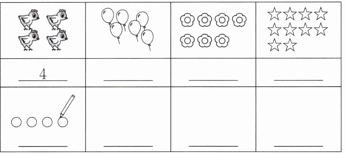 通过观察插图,第一行第一个图有4只小鸡,对应数字4;第二个图有6个气球,对应数字6;第三个图有7朵花,对应数字7;第四个图有10颗星星,对应数字10。第二行第一个图有4个圆圈,对应数字4。