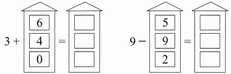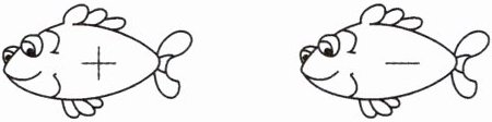 观察荷叶上的算式,3○2=1,5○5=0,9○1=8,结果均比左边第一个数小,可知○为“-”;2○4=6,0○9=9,8○2=6,结果与左边两数关系:2+4=6,0+9=9,8-2=6,其中前两个为“+”,第三个为“-”。综合小鱼图案,“+”鱼对应结果变大的算式,“-”鱼对应结果变小的算式。“+”鱼应在2+4=6、0+9=9荷叶下;“-”鱼应在3-2=1、5-5=0、9-1=8、8-2=6荷叶下。