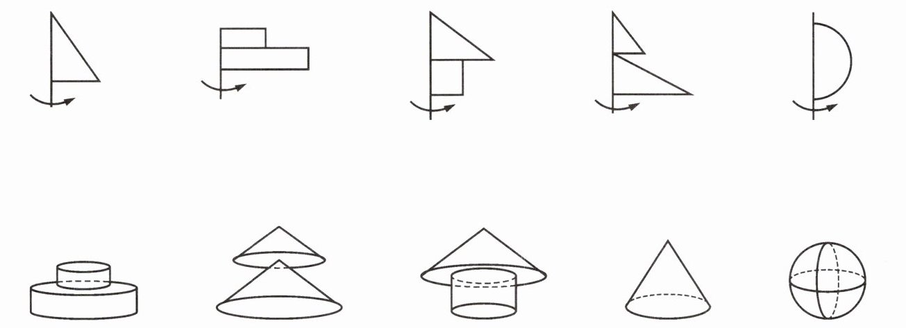 根据“面动成体”原理:直角三角形绕直角边旋转成圆锥;两个长方形阶梯状图形绕轴旋转成两个叠放圆柱;长方形与三角形组合图形绕轴旋转成圆柱和圆锥组合体;两个三角形组合图形绕轴旋转成两个叠放圆锥;半圆绕直径旋转成球。