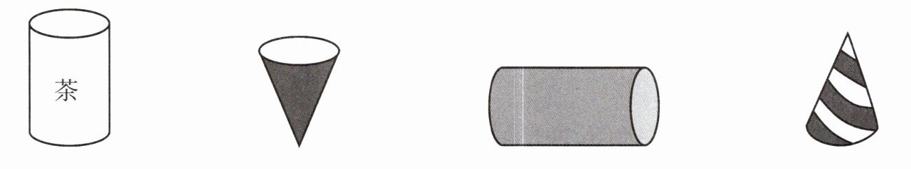 圆柱:水桶、铅笔、柱子、罐头;圆锥:沙堆、陀螺、圣诞帽、漏斗。