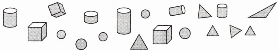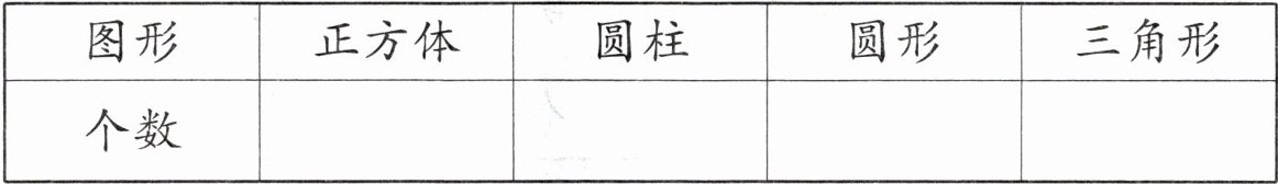 (1)观察图形,正方体有3个,圆柱有5个,圆形有5个,三角形有6个。(2)按立体图形和平面图形分类,立体图形有正方体和圆柱,共3+5=8个;平面图形有圆形和三角形,共5+6=11个。