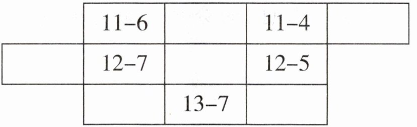 (1)根据20以内退位减法表规律,每行被减数相同,每列减数递增1。第一行补充11-5;第二行补充12-6;第三行补充13-8和13-6。(2)被减数有11、12、13,共3类。(3)各算式得数为5、6、7,共3类。
