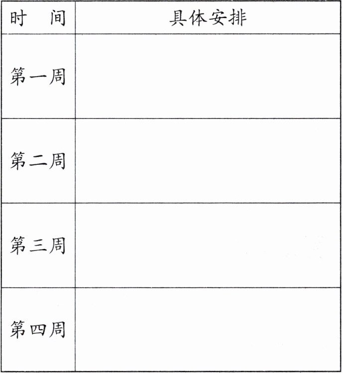 |第一周|完成寒假作业总量的30%,每天阅读课外书1小时,帮家长做1项家务|