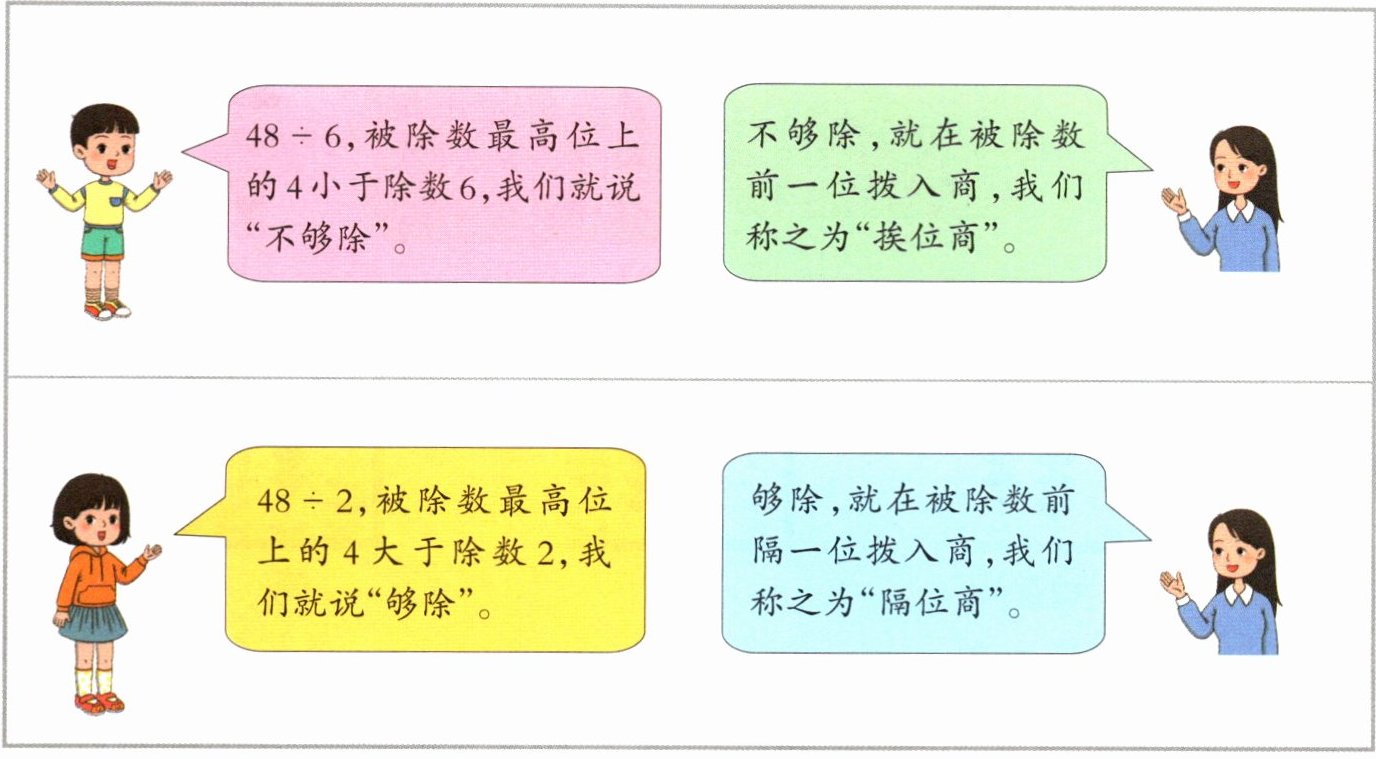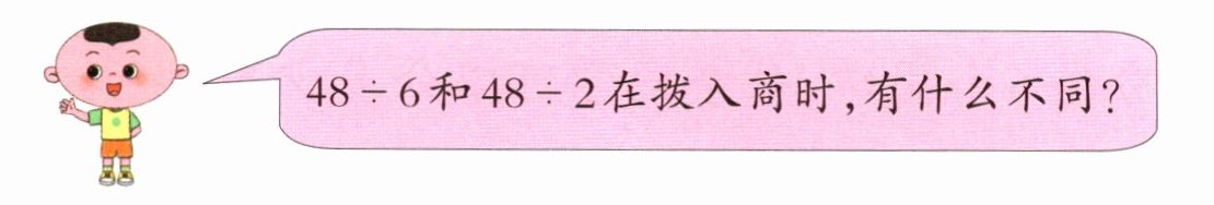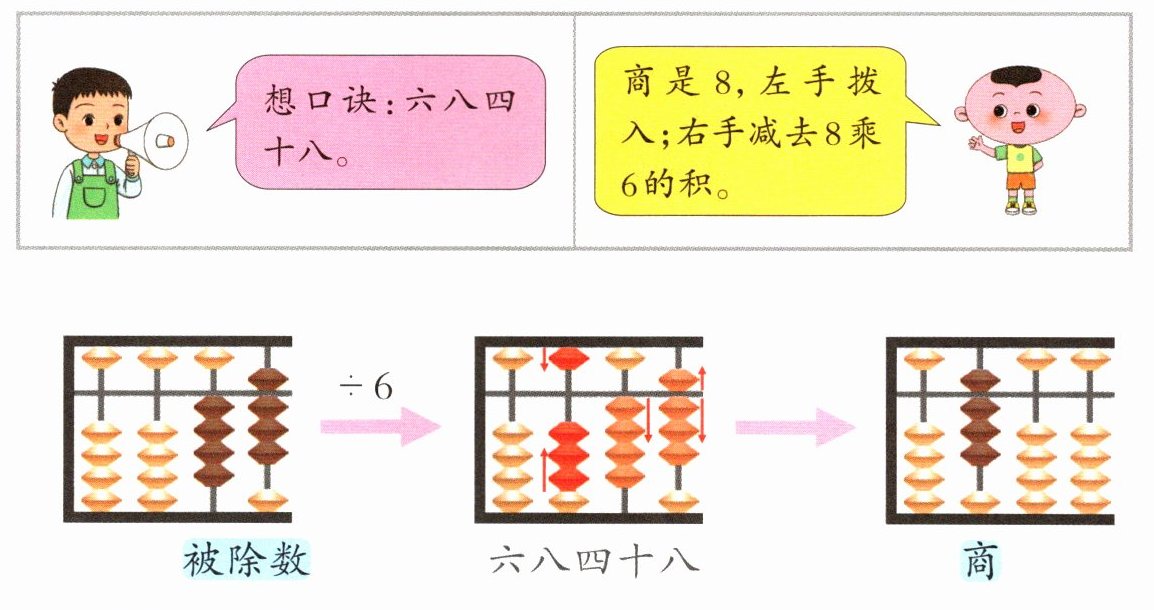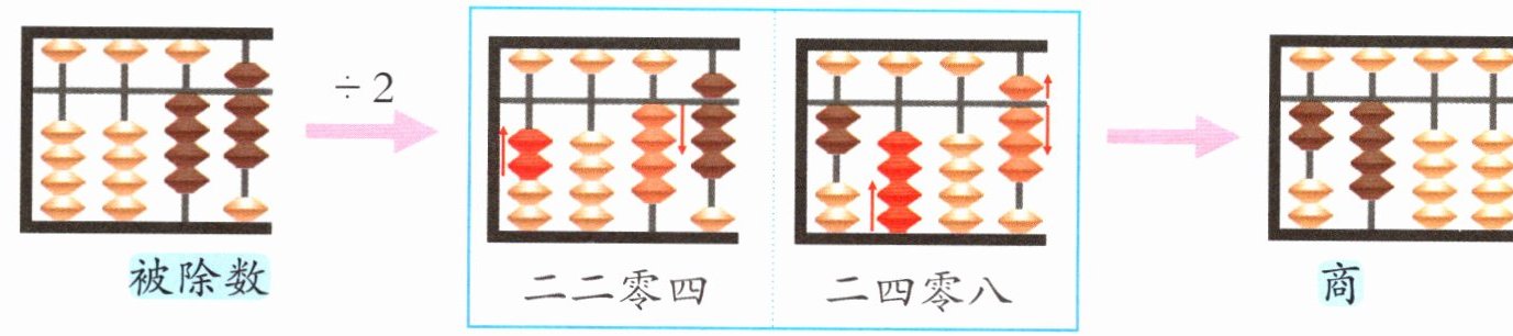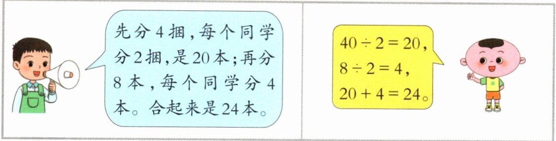 对于第二问,用算盘拨数计算,先分$4$捆,每个同学分$2$捆是$20$本,再分$8$本,每个同学分$4$本,合起来$20 + 4 = 24$本,即$48÷2 = 24$本。