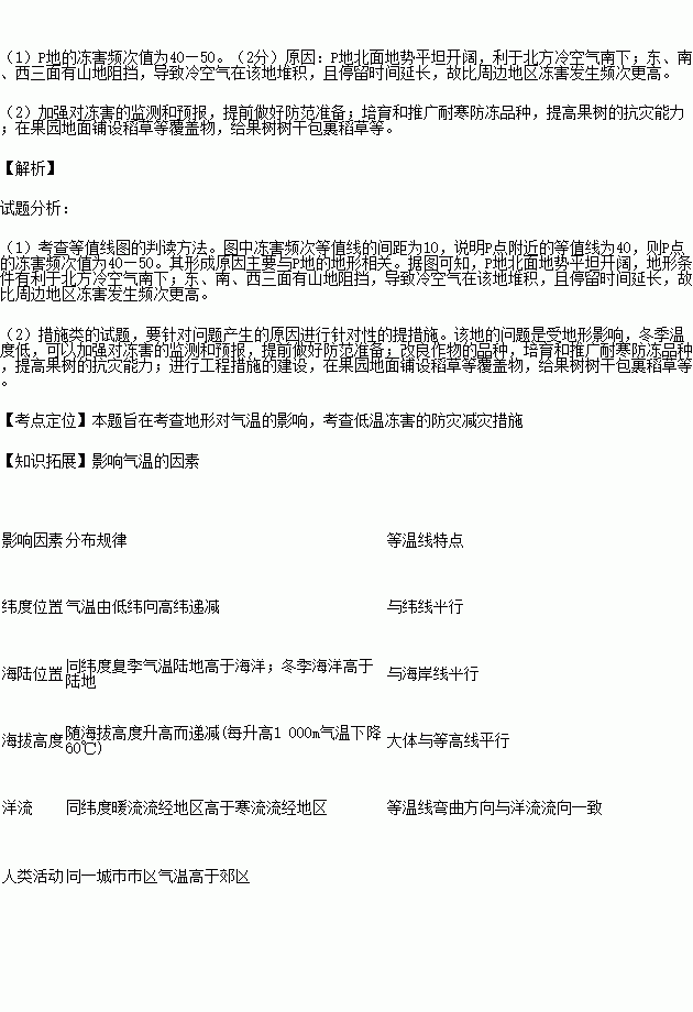 (1)若图中冻害频次等值线的间距为10,则P地的冻害频次值为多少?试分析P地冻害频次与周边差异较大的原因。