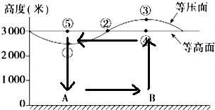 (2)A高空等压面下凹,故为低压,则大气近地面为下沉高压,B相反近地面为上升低压;在水平方向上大气由高压流向低压.故形成逆时针的环流.
