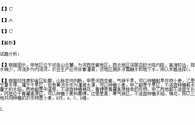 2.甲、乙、丙三个地区共同种植的主要粮食作物是