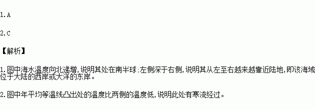 读某海域等深线和表层年平均等温线分布图,完成各题。