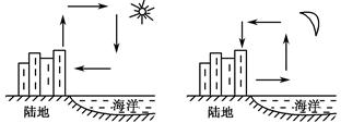 试题分析:本题考查海陆风示意图,白天陆地增温快,气压低,风由海洋吹向陆地,为海风;夜晚相反。海陆风的正确画法如下图所示: