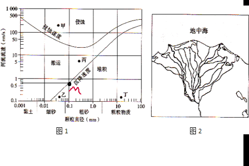 分析:此题考查地质构造与地表形态的变化.在河流的上游到下游,流水的搬运能力不同,泥沙堆积的颗粒也不同.从出山麓口往湖沼方向沉积物依次颗粒变小.原因:当流水携带大量泥沙流动时,由于流速的降低,泥沙逐渐沉积.一般颗粒大,比重大的先沉积,颗粒小、比重小的后沉积.物质在被流水搬运前是先被侵蚀的,在搬运的过程中因为水流速度的减小而出现沉积作用.根据坐标反映的关系,欲使直径为 0.1mm处于搬运状态的颗粒物堆积至河床,河流的速度下降到0.7 cm/s时,刚好达到沉降速度线M处,如图: