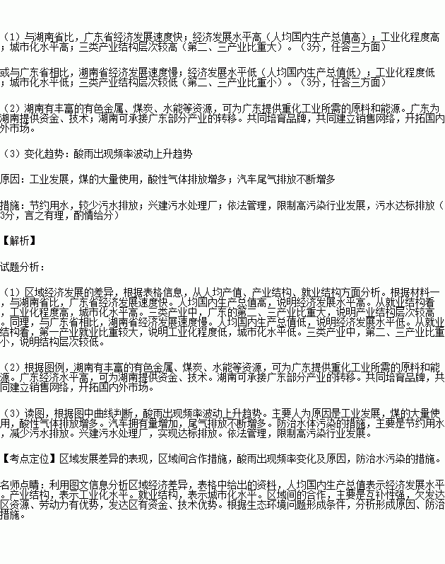 (1)依据材料一,比较广东、湖南两省区域发展差异的具体表现。