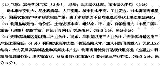 (3)结合材料三,简述天津滨海新区的产业结构与浦东、深圳的区别,并分析滨海新区在产业结构调整方面的主要措施可能有哪些。(10分)