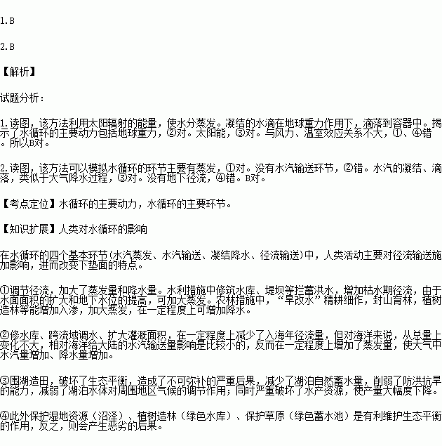 下图为某地理考察小组在沙漠地区利用“日光蒸馏法”取水示意图。回答下列各题。