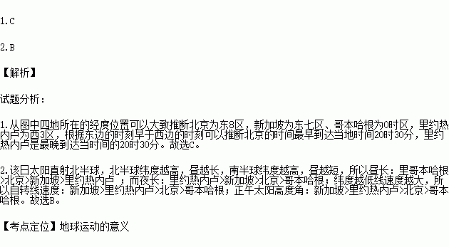 D.正午太阳高度角:里约热内卢>新加坡>北京>哥本哈根