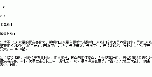 图乙为测得的图甲中L河流一水文站连续两日流量变化图。读下图回答下列各题。
