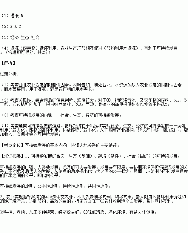 读下图“中国西北地区某农业科技园区循环经济模式图”,回答下列问题。(10分)