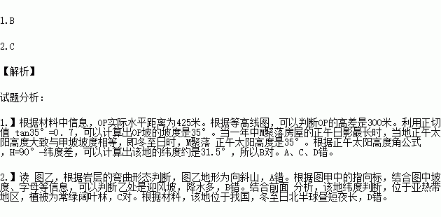 图甲为我国某农村聚落M所在区域的等高线地形图,OP实际水平距离为425米.图乙为沿PQ一线所做地质剖面示意图。M聚落分布于两边山脊对称的宽谷中, 当一年中M聚落房屋的正午日影最长时,当地正午太阳高度大致与甲坡坡度相等,且该日M聚落的日照时间从北京时间8:10至17:50,读图文材料回答下列 各题。(已知:tan30°=0.58 tan35°=0.7 tan40°=0.84)