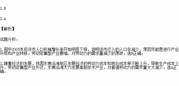 1.图中2005年后该市人口机械增长率开始明显下降的原因是