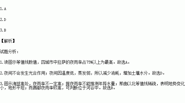 Ò¹ÓêÊÇÖØÒªµÄÅ©ÒµÆøºò×ÊÔ´£¬Æä¶àÉÙ³£ÓÃÒ¹ÓêÂʱíʾ¡£Ò¹ÓêÂÊÊÇÒ¹¼ä½µÓêÁ¿Õ¼ÈÕ½µÓêÁ¿µÄ°Ù·ÖÂÊ¡£Í¼Ê¾ÒâÇà²Ø¸ßÔ²¿·ÖµØÇøÏᆵ½¾ùÒ¹ÓêÂÊ(%)µÄ¿Õ¼ä·Ö²¼¡£¾Ý´ËÍê³ÉÏÂÁÐÎÊÌâ¡£