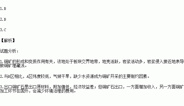有色金属矿物是岩浆在冷却过程中矿物富集形成的。下图所示国家铜矿资源丰富、品质优、埋藏浅、分布广泛。该国大量出口铜矿石,开采铜矿需要用大量水来控制粉尘。铜矿经济给本国带来经济效益的同时,也造成很多问题。据此完成下列问题。