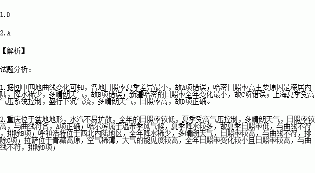 日照率是指一定时段内,实际日照总时数占可照总时数的百分率,下图为我国四地多年平均日照率月份变化统计图。读图完成下列问题。