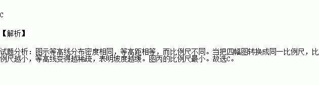 读下面的等高线图(图中的等高距相同),四幅图中坡度最缓的是