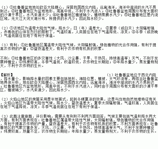 (1)吐鲁番盆地年降水量16mm,蒸发量3000mm,是中国的干极。分析吐鲁番盆地年降水量较少的原因。