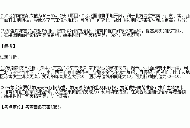 (1)若图中冻害频次等值线的间距为10,则P地的冻害频次值为多少?试分析P地冻害频次与周边差异较大的原因。