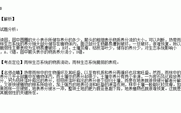 下图为热带雨林生态系统物质流动示意图(图中圆圈的大小表示所储存养分的多少,箭头的粗细表示物质养分流的大小)。热带雨林生态系统的脆弱性主要表现为