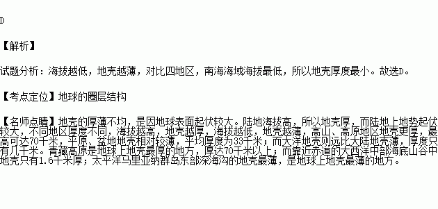 2013年,我国研发的钻机“地壳一号”前往东北平原执行“中生代白垩纪大陆科学钻探”任务。据此完成下列问题。下列地区的地壳平均厚度最小的是