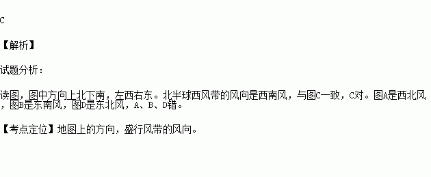 下面四个风向箭头中正确表示 北半球西风带风向的是( )