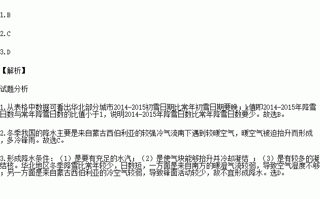 读我国华北部分城市初雪日期和2014年12月-2015年2月降雪日数与常年降雪日数的比值(K)统计表(表1),回答下列问题。