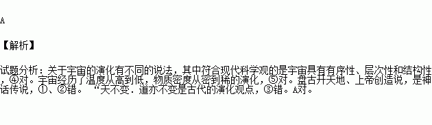 ①盘古开天地 ②上帝创造说 ③“天不变.道亦不变 ④宇宙具有有序性、层次性和结构性 ⑤宇宙经历了温度从高到低,物质密度从密到稀的演化