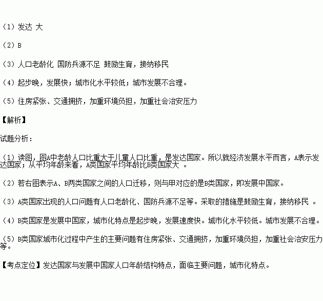 (1)就经济发展水平而言,A表示 国家;从平均年龄来看,A类国家平均年龄比B类国家 。