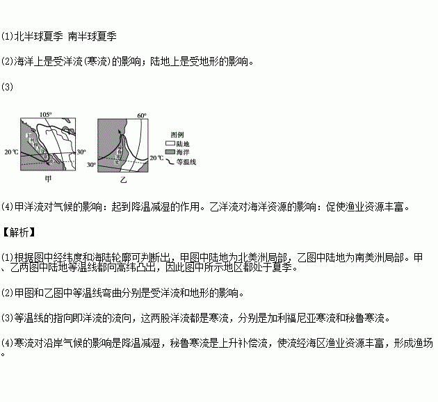 (4)分析甲图中洋流对沿岸气候和乙图中洋流对海洋资源的影响。