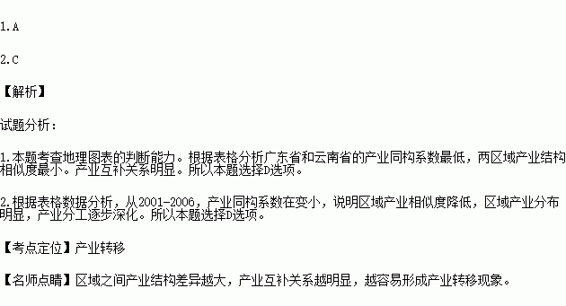产业同构系数是对产业相似程度的一种测度,指数越低,代表两区域产业结构相似度越小,反之,两区域产业结构有趋同现象。下表为泛珠三角部分省区产业同构系数。据此回答下列各题。