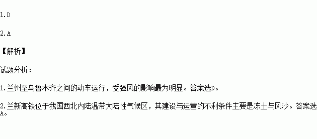 2014年12月26日上午开通兰州至乌鲁木齐首趟动车,这标志着世界一次性建设里程最长的高速铁路将全线开通运营。在新疆境内 65%的路段建有防护墙、地上隧道等防护工程,读图回答下列问题。
